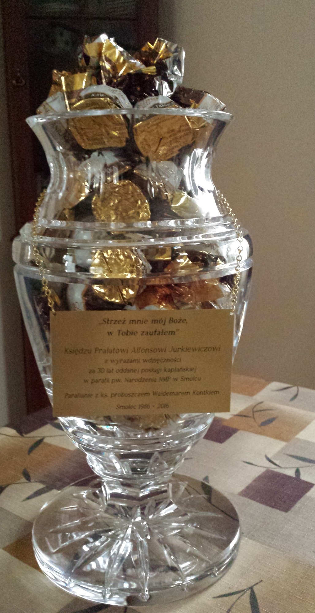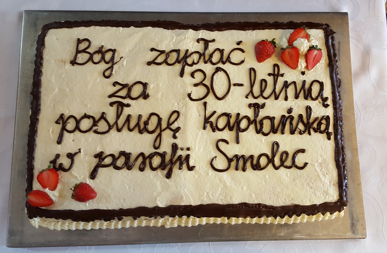 W niedzielę 20 czerwca 2016 r. odbyła się uroczysta Msza Święta z okazji 30-lecia posługi kapłańskiej Księdza Prałata, Alfonsa Jurkiewicza, w smoleckiej parafii oraz 57. rocznicy przyjęcia święceń kapłańskich. Po nabożeństwie wszyscy parafianie zostali zaproszeni do ogrody, by skosztować pysznego tortu upieczonego specjalnie z tej okazji. Ks. Prałat dziękował za życzliwość, miłość, a w szczególności za modlitwę, którą otaczają go parafianie.