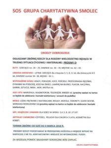 Grupa Charytatywna działająca przy naszym kościele zwraca się do wszystkich parafian z serdecznym apelem o pomoc rodzinie, która znalazła się w bardzo trudnej sytuacji materialnej. Potrzeby rodziny, której tym razem chcemy pomóc są ogromne, więc gorąca prośba o otwartość naszych serc, szczególnie w okresie Wielkiego Postu. Listę potrzebnych rzeczy można znaleźć na poniższym plakacie. Dary zbierane będą do 8 marca 2018.