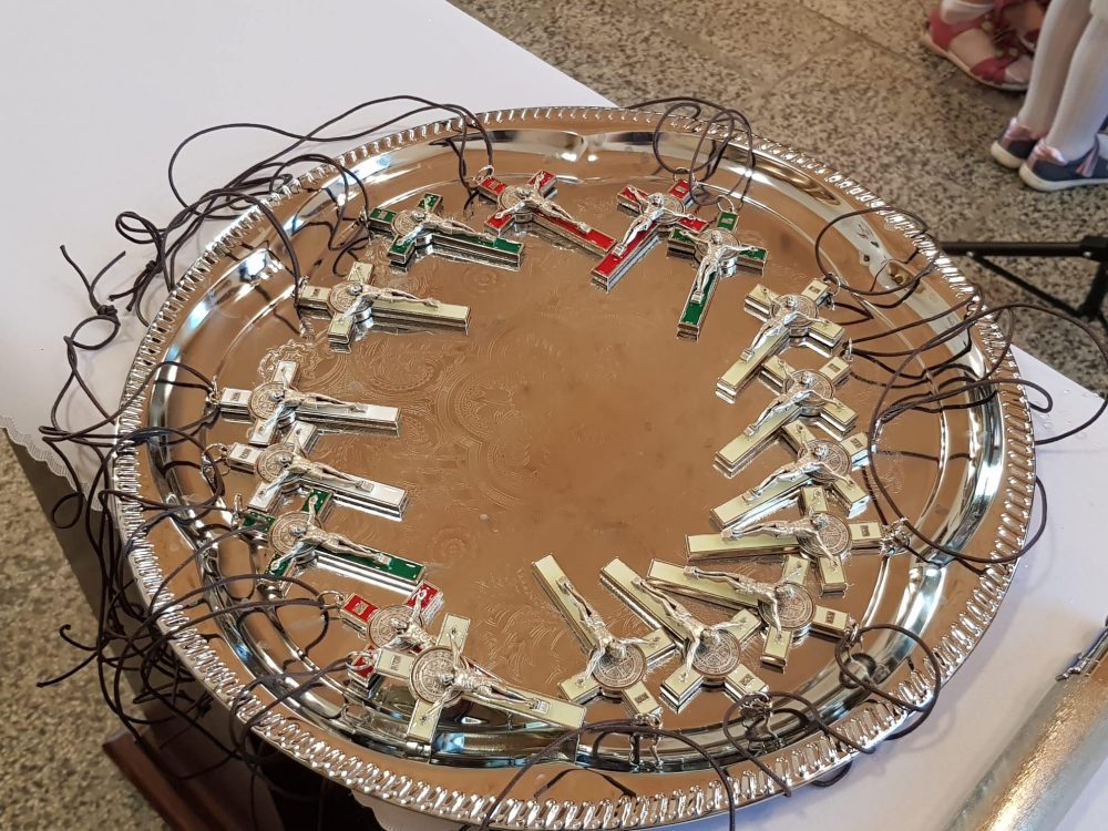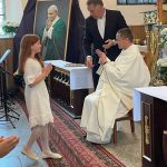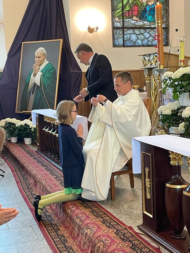 Podczas dzisiejszej Mszy św. nowi członkowie zostali uroczyście włączeni do liturgicznej służby scholii parafialnej poprzez złożenie przyrzeczenia, a ceremonię dopełnił ks. proboszcz nakładając krzyże im na szyję.