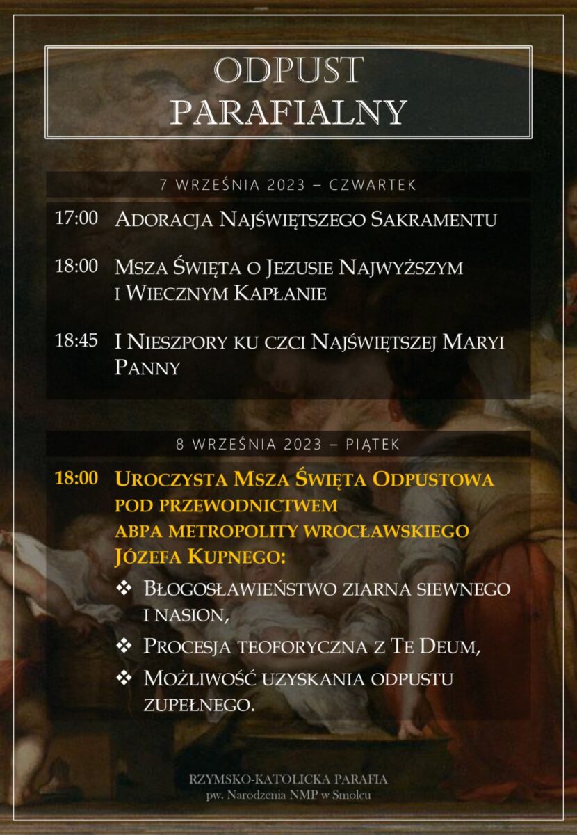 Wszystkich parafian i gości serdecznie zapraszamy na uroczystości odpustowe do naszego kościoła 08 września, w piątek, w święto Narodzenia Najświętszej Maryi Panny. Mszy św. o godz. 18.00 będzie przewodniczyć ks. abp Józef Kupny Metropolita Wrocławski. Nasze obchody odpustowe rozpoczniemy już dzień wcześniej, w czwartek 07 września o godz. 18.45 modlitwą Pierwszymi Nieszporami z uroczystości odpustowej. Szczegóły na plakacie.