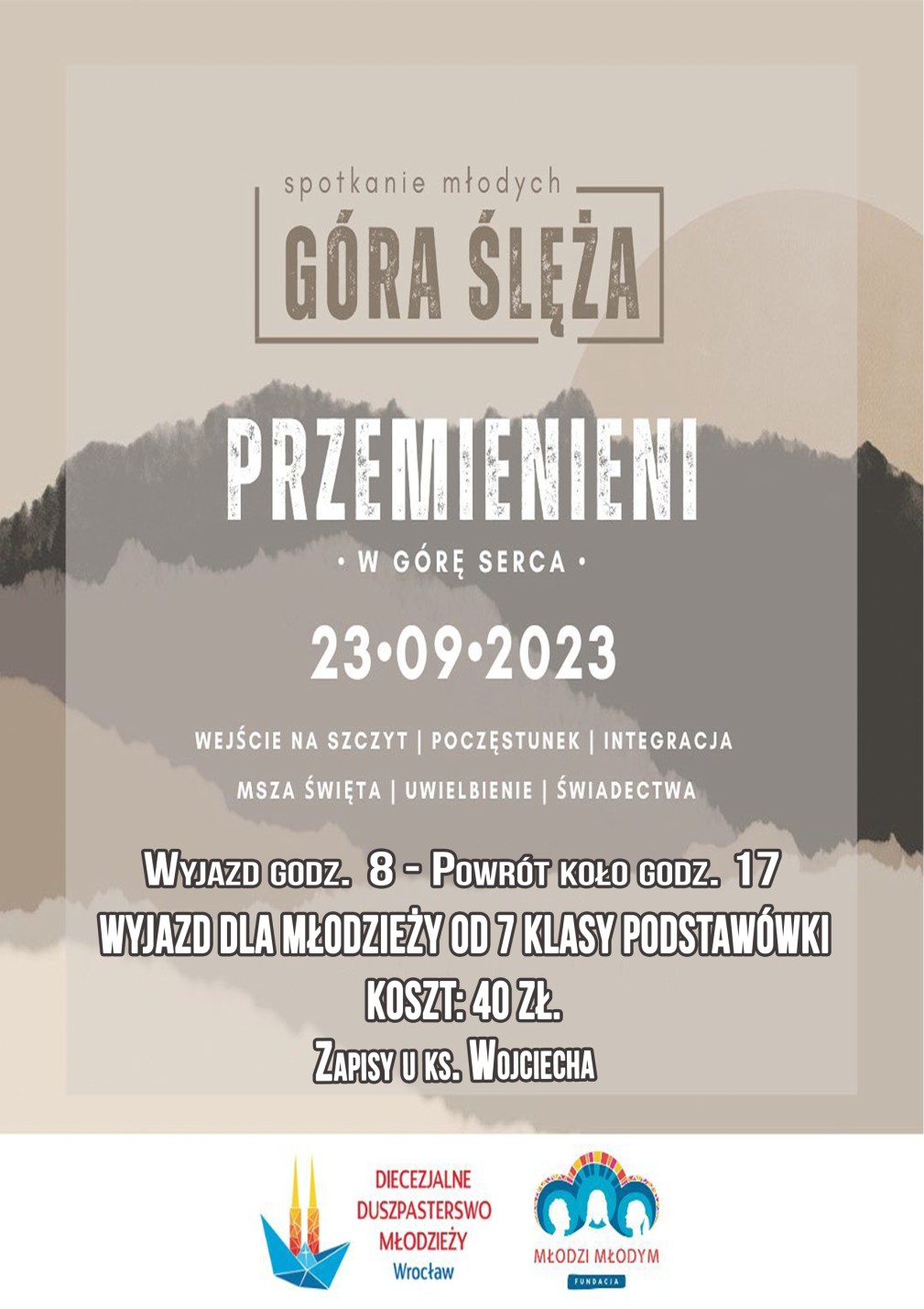 Ks. Wojciech serdecznie zaprasza młodzież (od 7 klasy szkoły podstawowej) 23 września na wyjazd na Górę Ślężę na Spotkanie Młodych. Wyjazd ok. godz. 8.00, powrót ok. godz. 17.00. Koszt 40 zł.