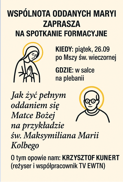 Wspólnota Oddanych Maryi zaprasza w najbliższy piątek, 26.09 na spotkanie formacyjne poświęcone tematowi: Jak żyć pełnym oddaniem Matce Bożej na przykładzie św. Maksymiliana Kolbego. Spotkanie odbędzie się po Mszy św. wieczornej w salce na plebanii. Prelekcję wygłosi pan Krzysztof Kunert, reżyser filmowy, na co dzień współpracujący z katolicką telewizją EWTN.