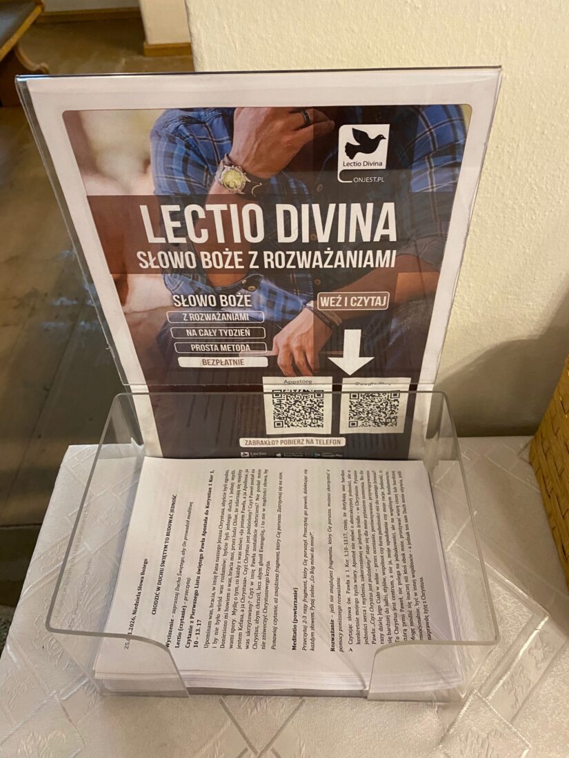 A dla tych bardziej mobilnych polecamy zakładkę lectio divina w aplikacji Pismo Święte lub Lectio Divina – On jest, do której kod QR znajduje się na plakacie w gablocie. Niech praktyka Bożego czytania lectio divina każdego dnia pomaga nam wszystkim wzrastać. Niech Słowo Boże, które było na początku, przemienia nas każdego dnia. Amen.