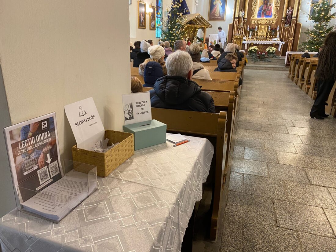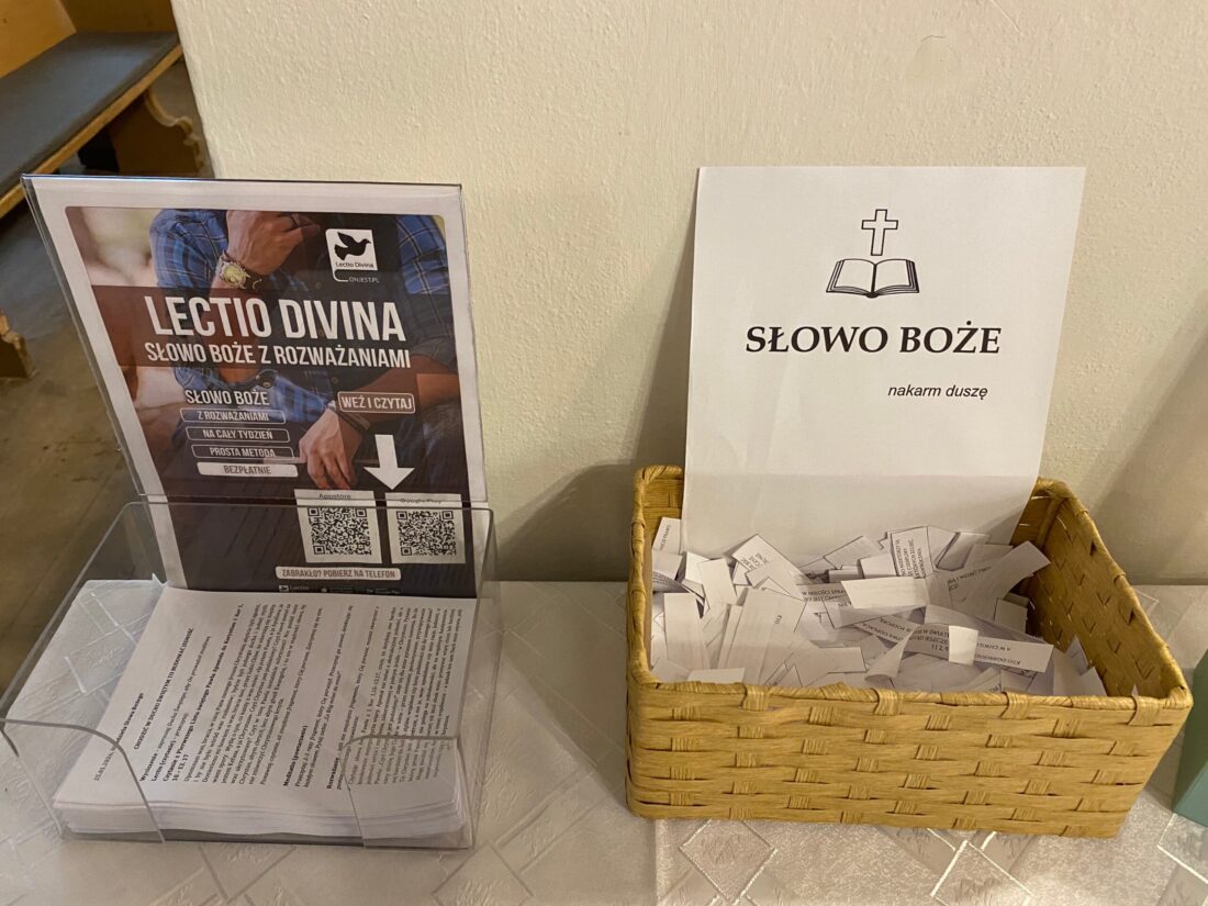 Dlatego nie musimy martwić się jak praktykować lectio divina. Razem z Kręgiem Biblijnym działającym przy naszej parafii chcemy zaproponować Wam pomoc, dzięki której ta starożytna forma modlitwy będzie mogła zagościć i w naszym życiu. Na stoliku przy filarze regularnie będą się pojawiać propozycje przebiegu lectio divina dopasowane do Liturgii Słowa każdej niedzieli. Będą to wskazówki, które pomogą nam zatrzymać się nad Słowem Bożym, odkryć jego piękno i doświadczyć obecności Boga w modlitwie.