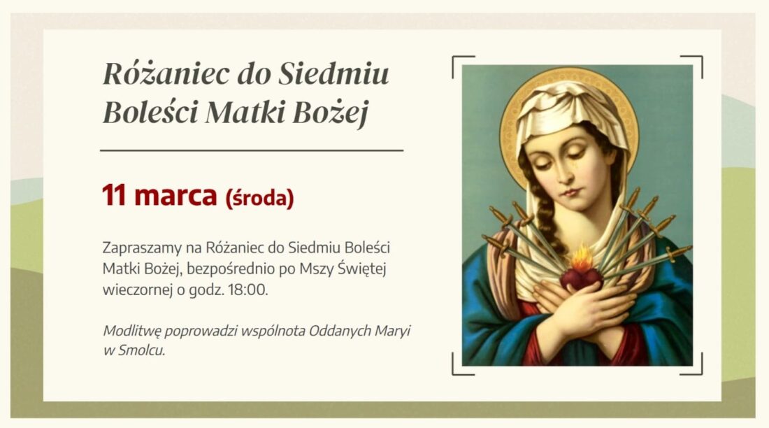 W najbliższą środę, 11 marca, bezpośrednio po mszy wieczornej, wspólnota oddanych Maryi zaprasza na różaniec do Siedmiu Boleści Matki Bożej. Modlitwa ta znana jest w Kościele Katolickim od XIII wieku dzięki zakonowi serwitów, a przypomniana została współcześnie podczas objawień Maryi w Kibeho w 1982 roku. W koronce tej rozważa się siedem bolesnych wydarzeń z życia Maryi, niektórzy z nas mieli już okazję w naszym kościele w takiej modlitwie uczestniczyć.